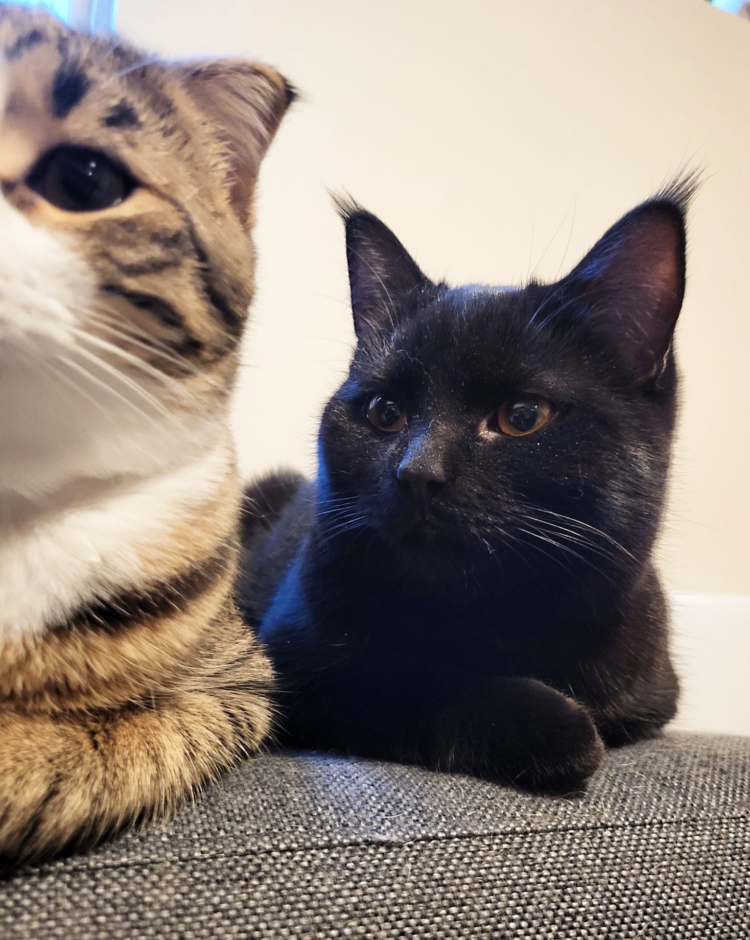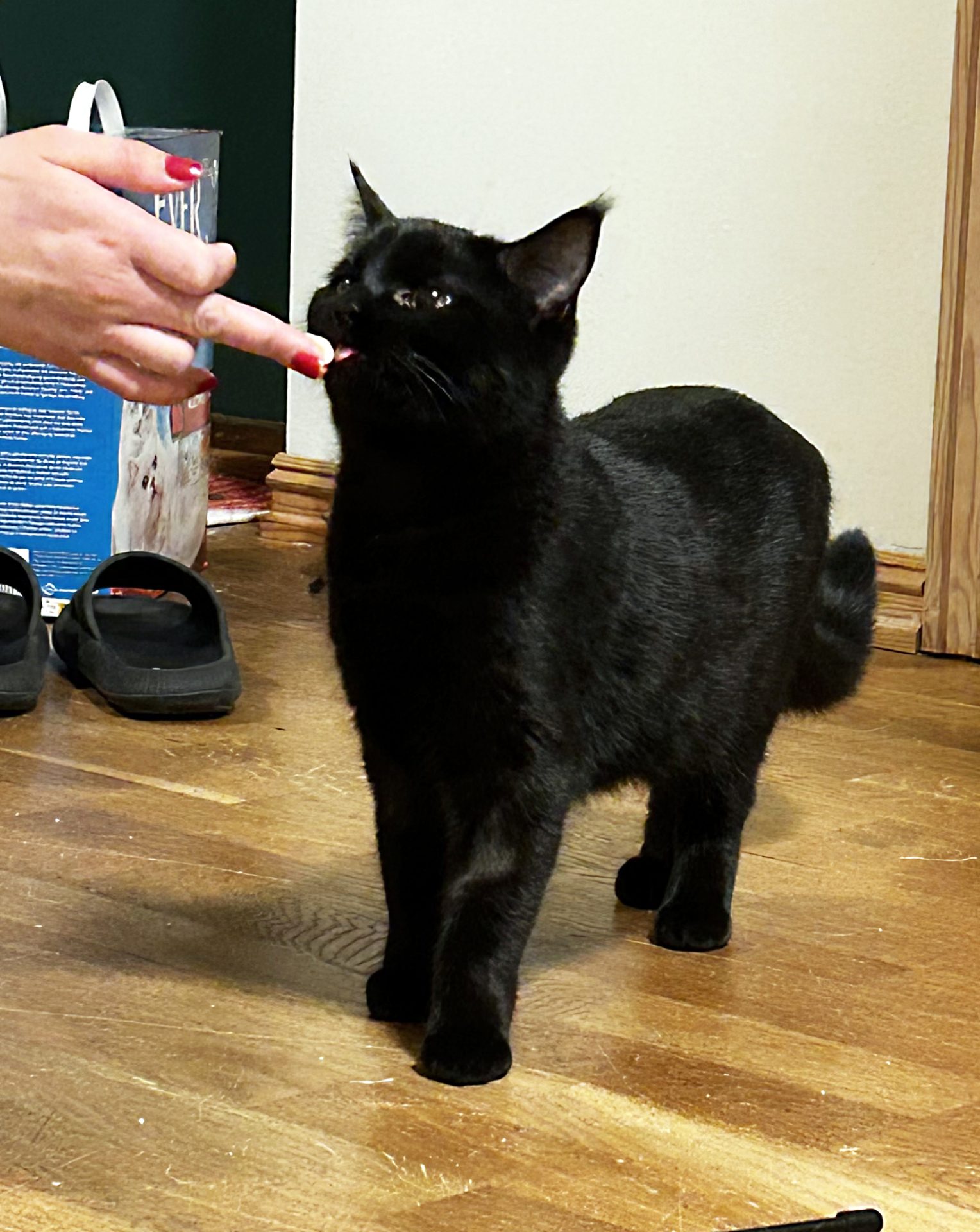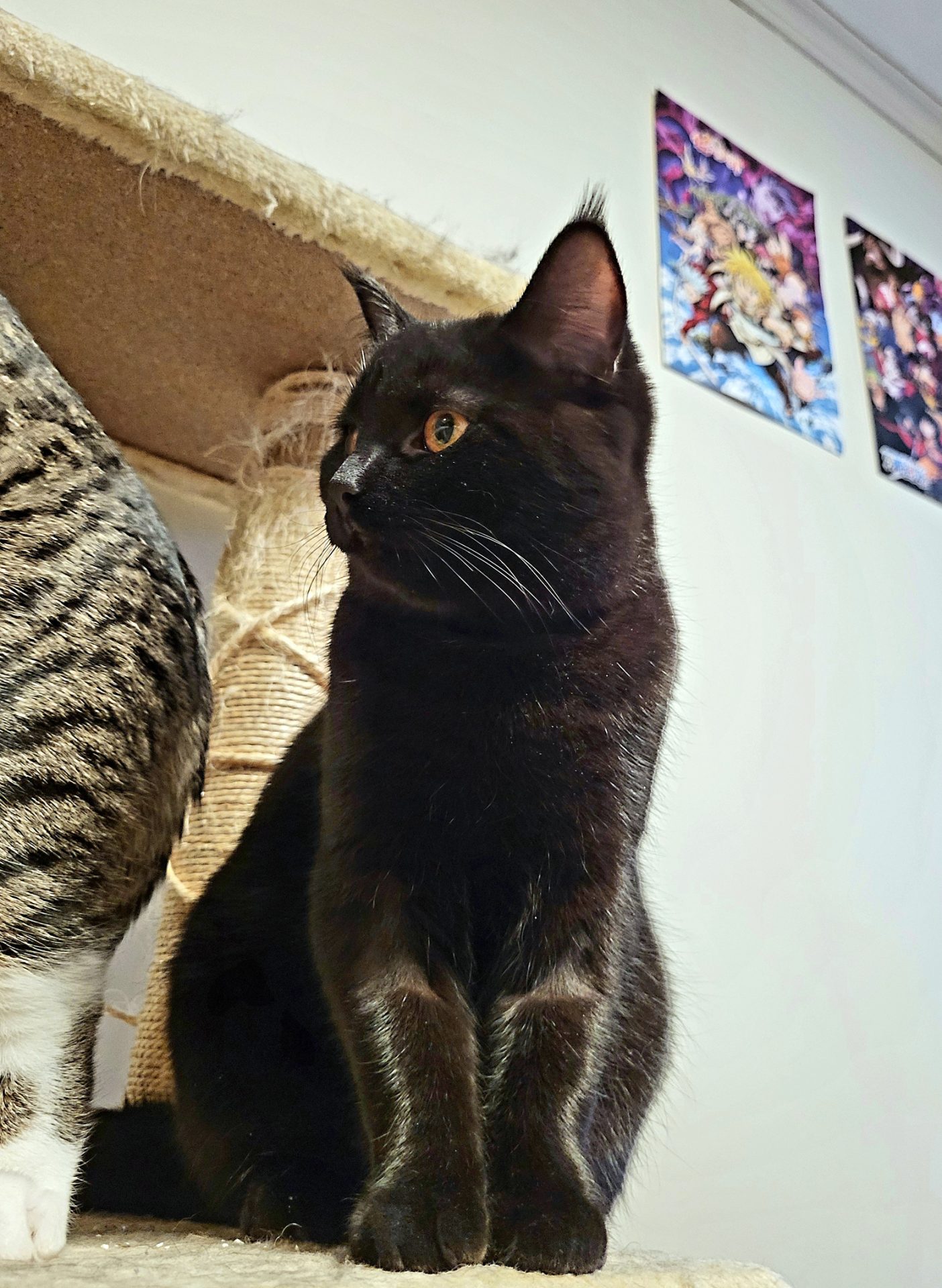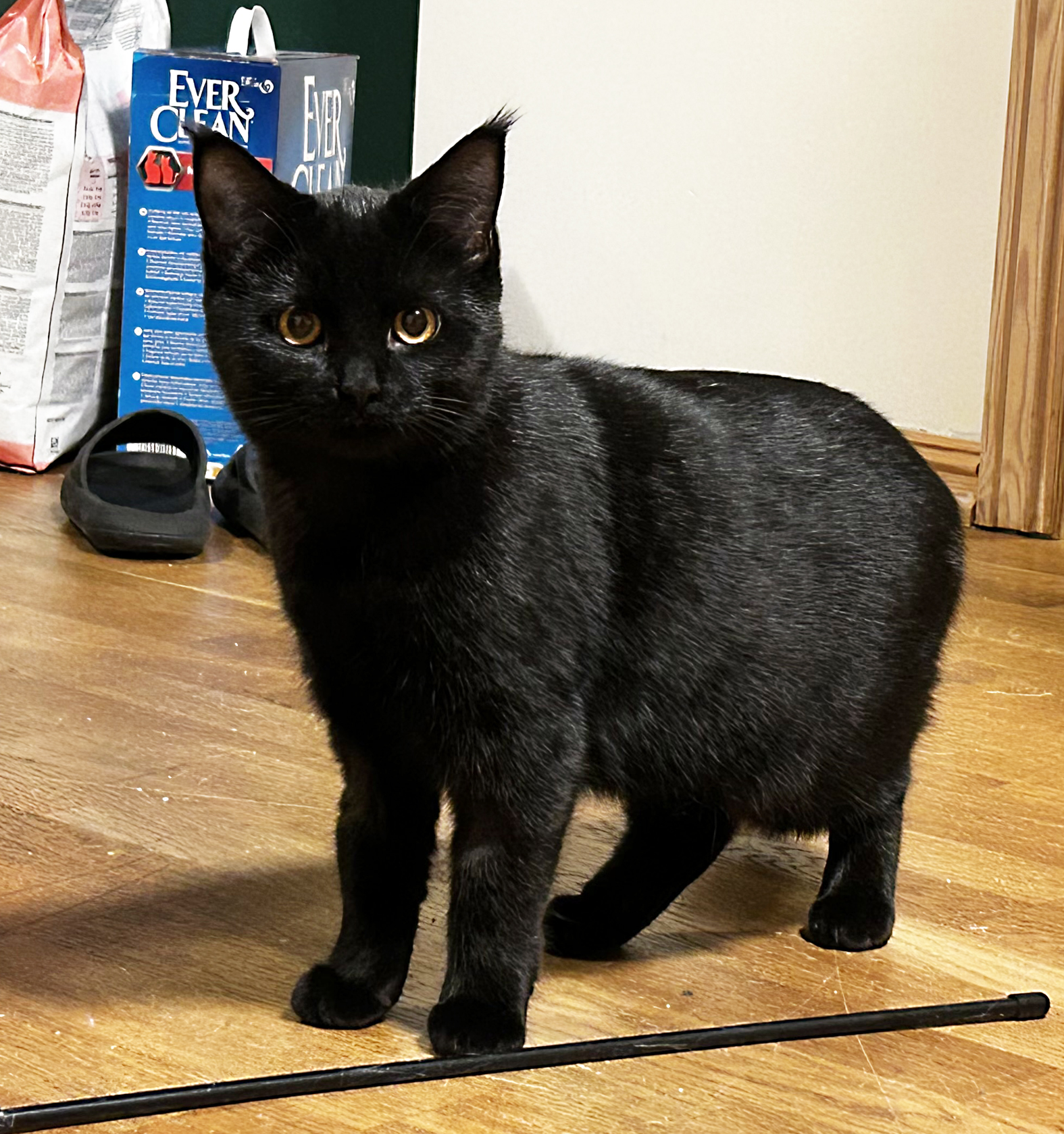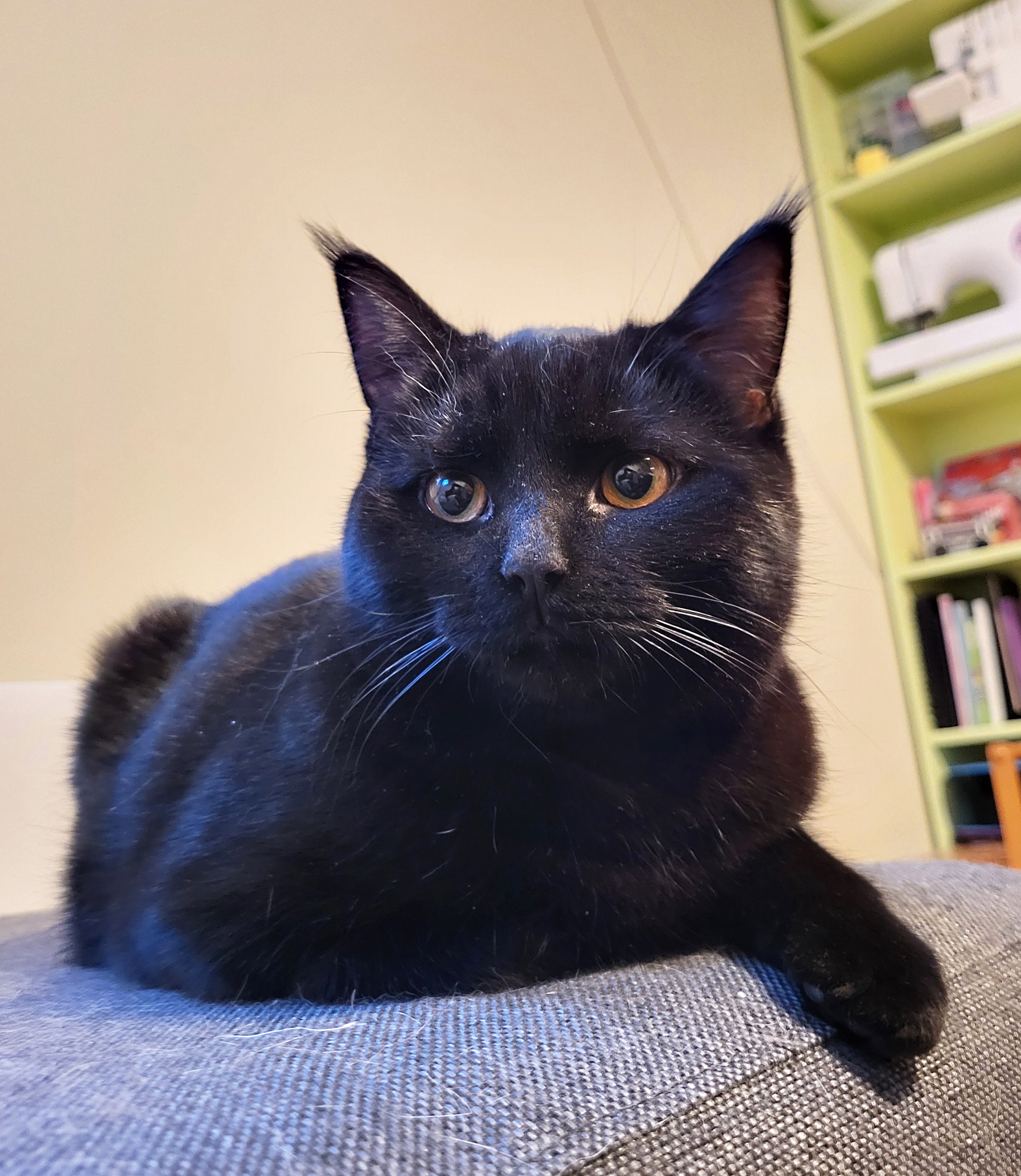 Hun har nydelig gule øyne og svart pels med en liten hvit prikk på siden av låret.