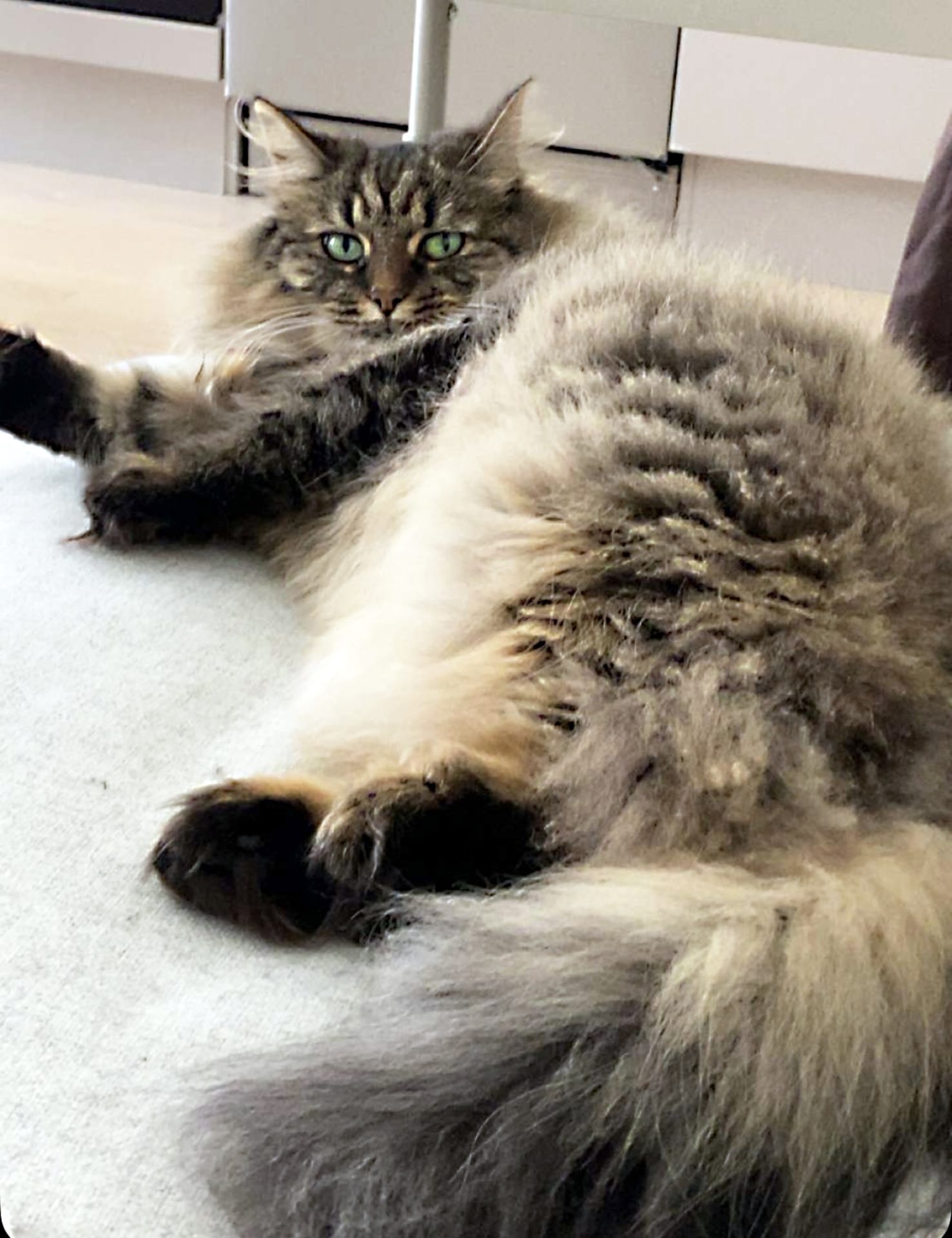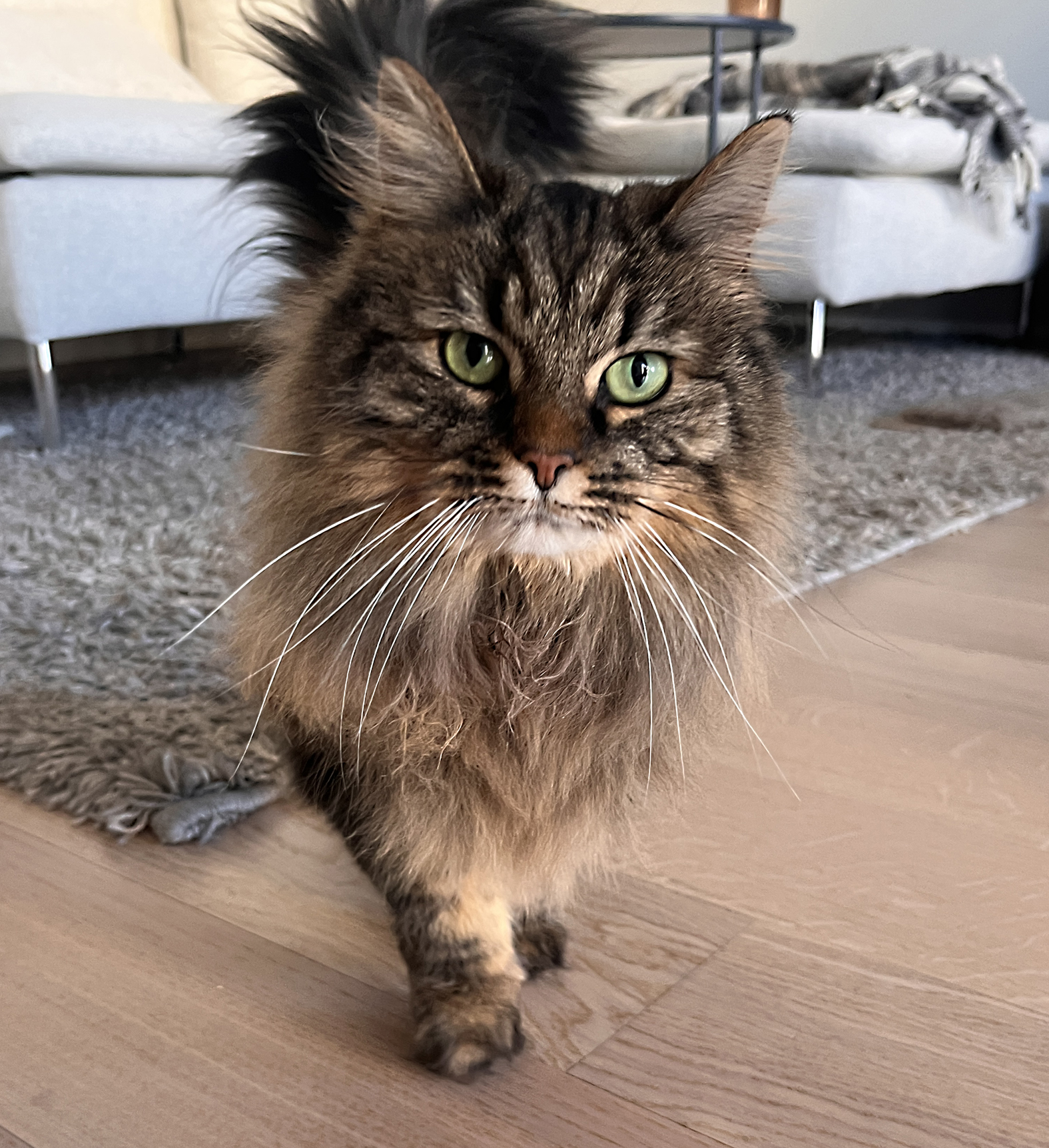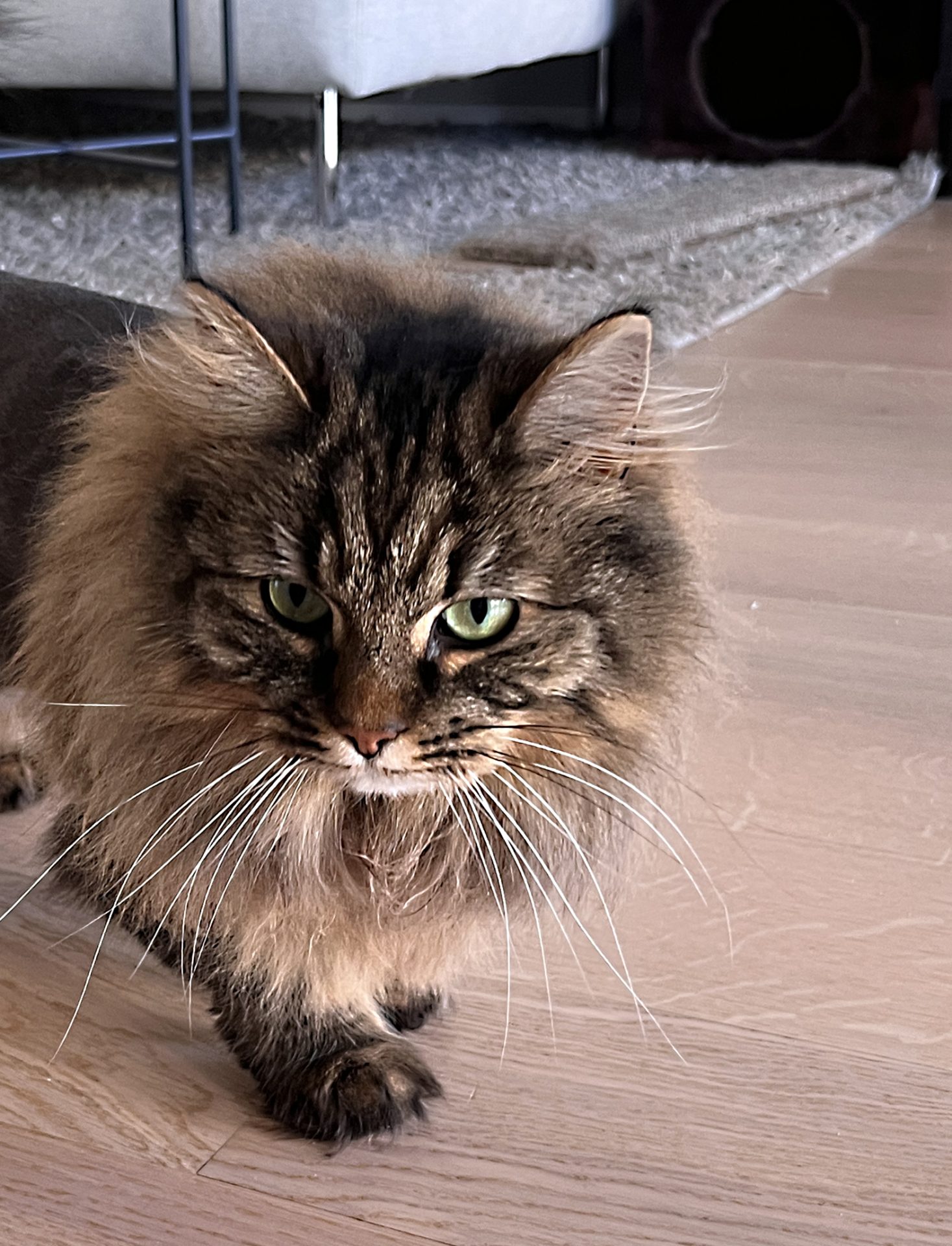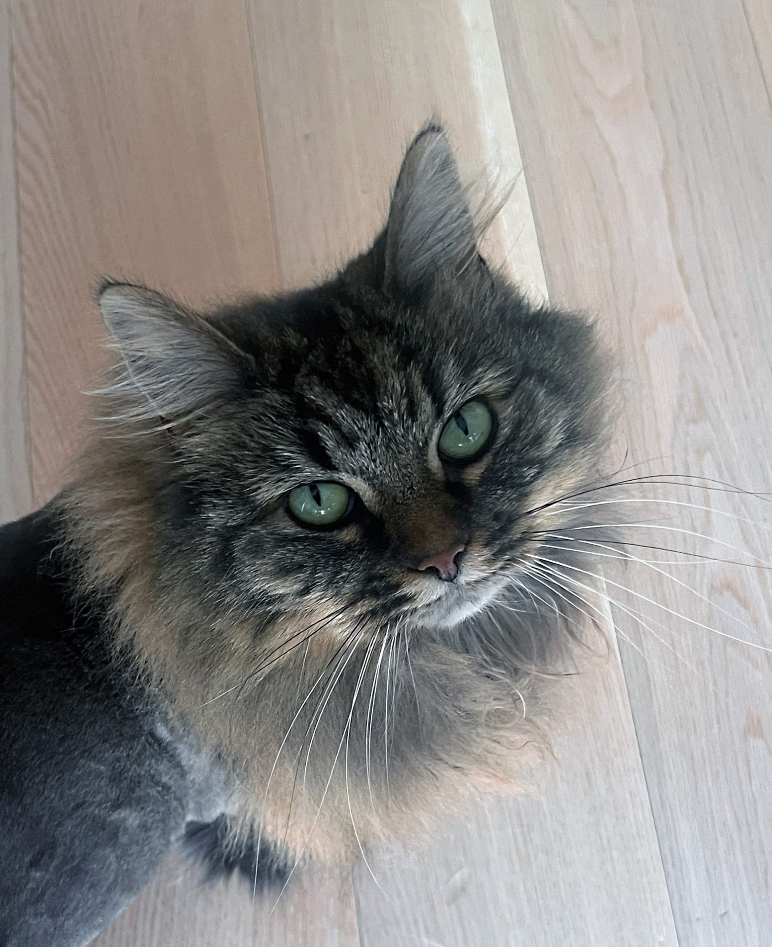 6 år gamle Molly er en nydelig, rolig og kosete katt med mye mimikk. Hun kan begynne å male bare man blunker til henne og snakker rolig. Det er uvisst om hun er rasekatt, men hun har mange av trekkene til en norsk skogkatt, både i utseende og personlighet. Hun har lang og matt pels og må derfor børstes ukentlig for å unngå tover, men det har hun ikke noe problem med så lenge det kombineres med en kose-økt! Akkurat nå har Molly "løveklipp" fordi hun fikk noen tover bakover i pelsen som ble litt for vanskelig å gre ut. All pelsen kan få henne til å se tykk ut, men hun er egentlig en veldig liten og slank katt.